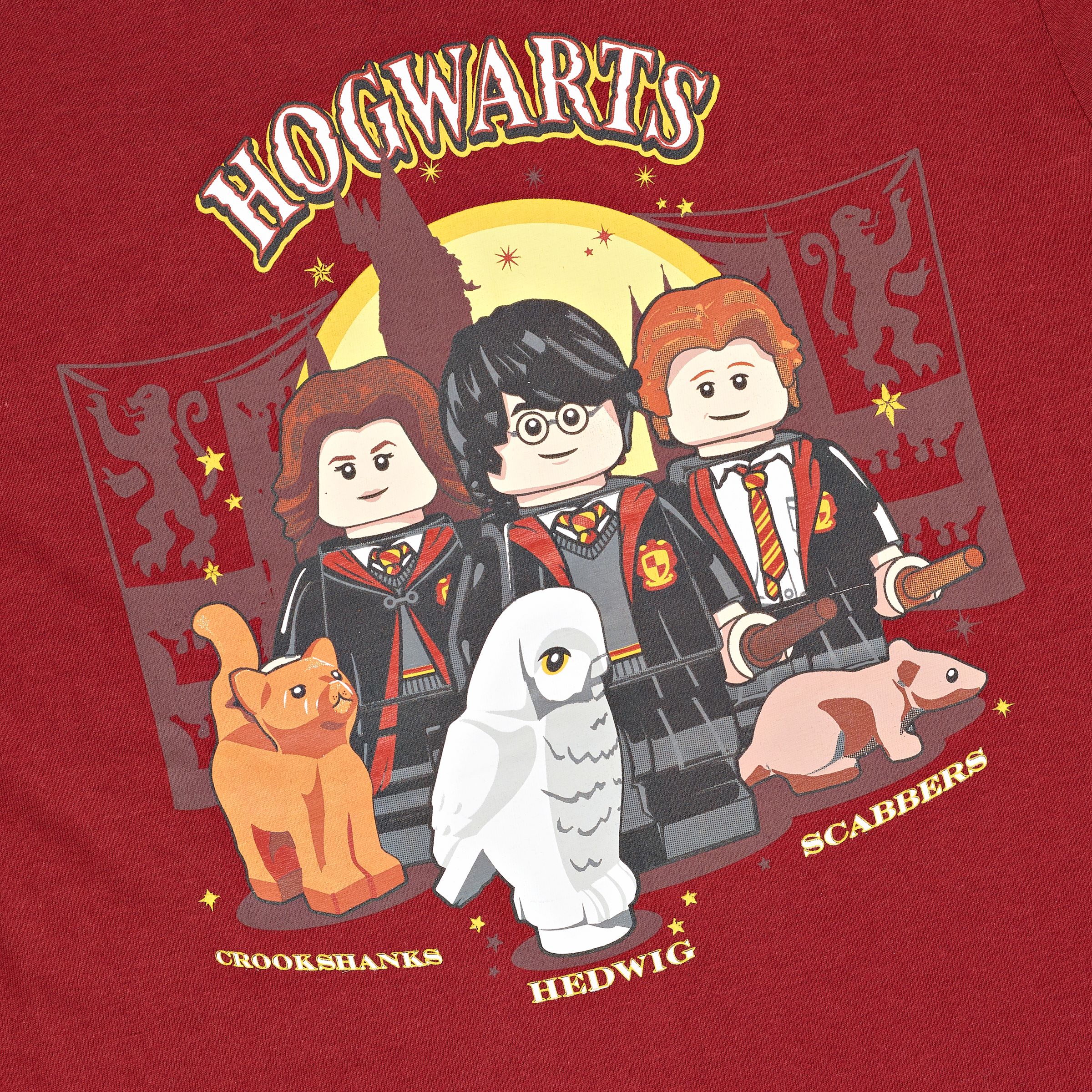 Let young fans wear their love for iconic Hogwarts™ students and their pets with this unisex LEGO® Harry Potter™ T-Shirt. It features a screen-printed illustration of Harry Potter, Hermione Granger™ and Ron Weasley™ LEGO minifigures with their pets Hedwig™, Crookshanks and Scabbers™. A magical fashion gift idea for kids, this burgundy red, machine-washable, 100% cotton tee is available in various sizes for ages 4 to 14.