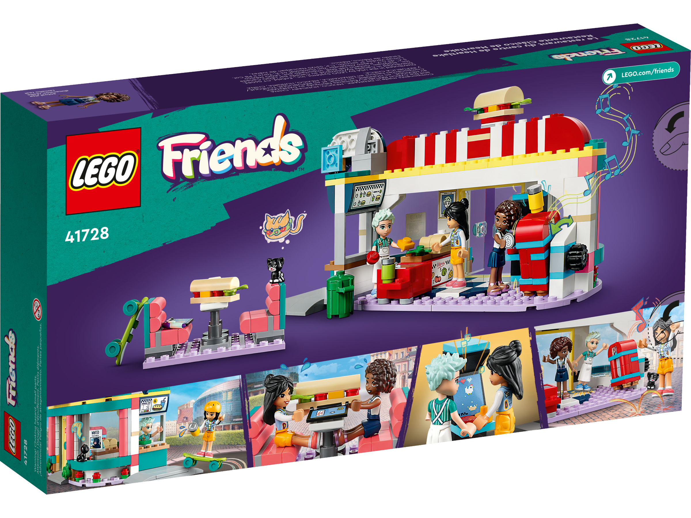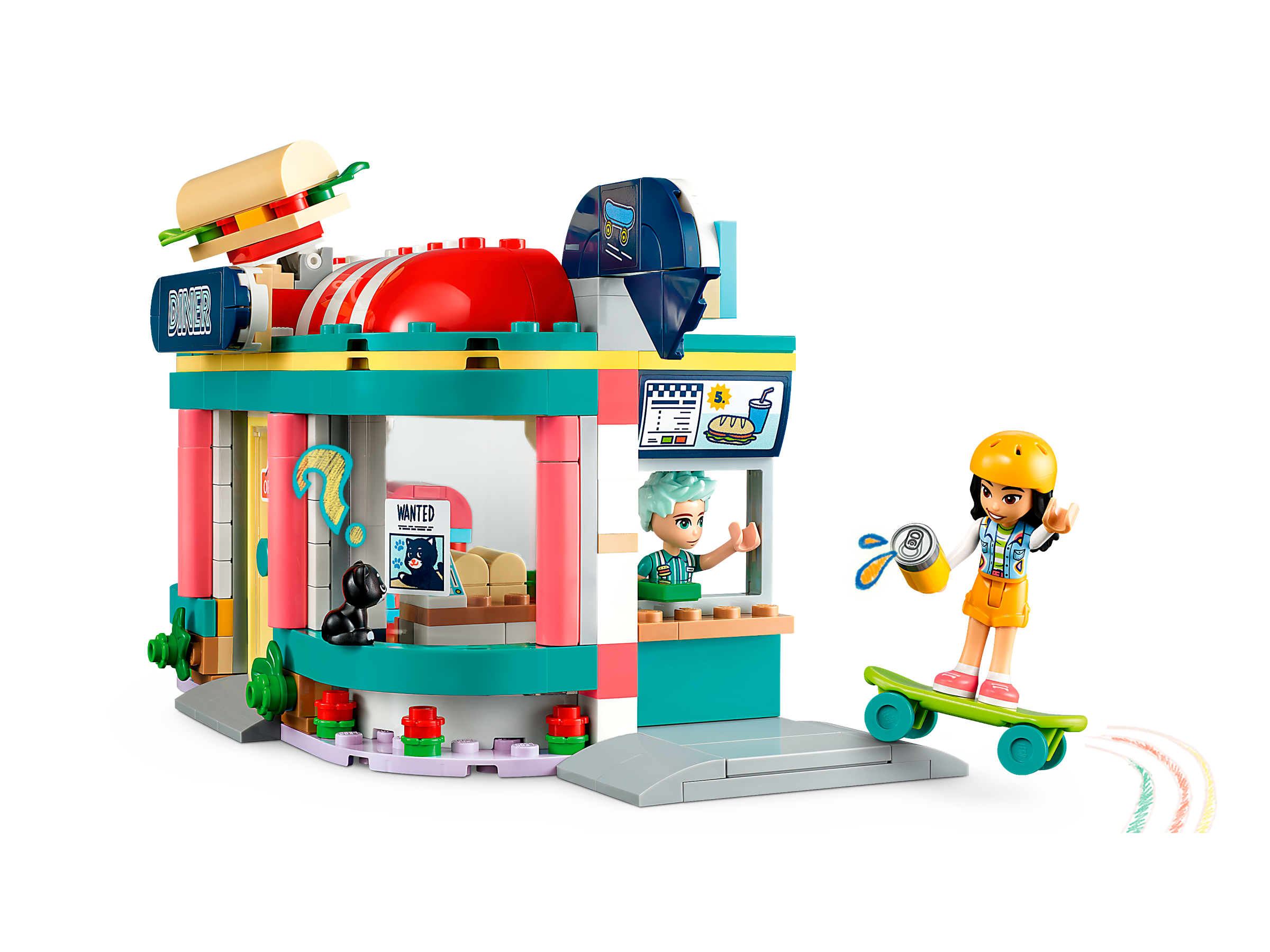Kids aged 6 and up can role-play lots of restaurant stories with this LEGO® Friends Heartlake Downtown Diner (41728) building toy set. With lots of accessories to inspire creative play, they can pretend to make sandwiches or imagine being a customer at the diner. Features include a drive-through, outdoor seating, plus an arcade game and a moving jukebox. Kids can use the salad ingredients in the fridge to customize sandwiches. Other accessories include 2 drinks, money, 3 slices of bread for sandwiches, a napkin holder, a trash can and a skateboard. There’s also a mischievous cat who loves to visit the diner!