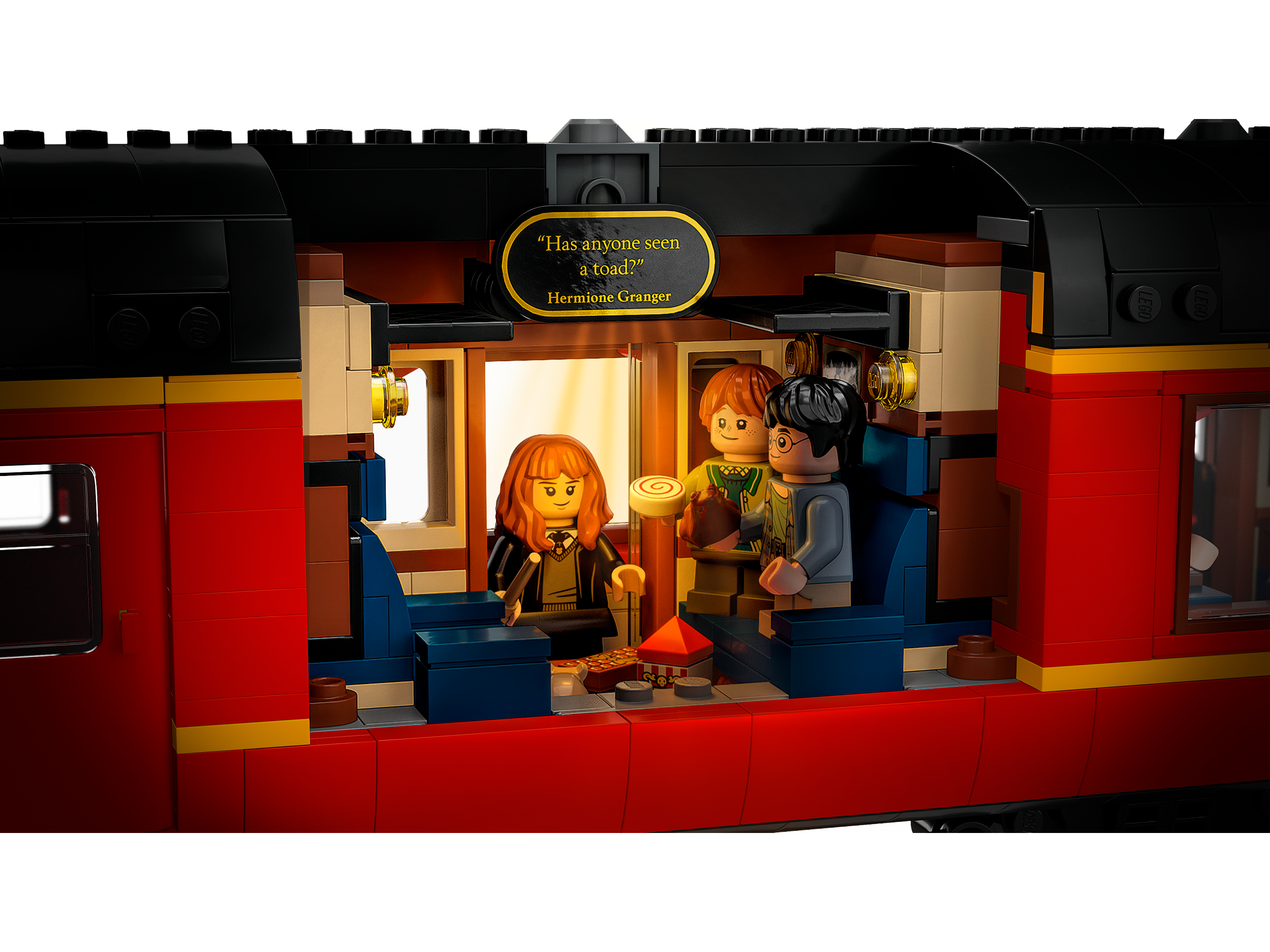 The engine features a detailed underside and a lever on the top that causes the train to rock with the motion of a steam train. A tender carries the engine’s supply of coal. The passenger carriage comprises 3 compartments, each depicting a classic scene: when Harry, Ron and Hermione meet in the series’ first film; when Professor Lupin saves Harry from the Dementor™ in the third film; and when Luna saves Harry from Draco’s spell in the sixth film. The model also depicts Platform 9¾ at King’s Cross Station, where the adult Harry and Ginny wait with their children, Lily, James and Albus, ready for Albus’s first trip aboard the amazing Hogwarts Express.