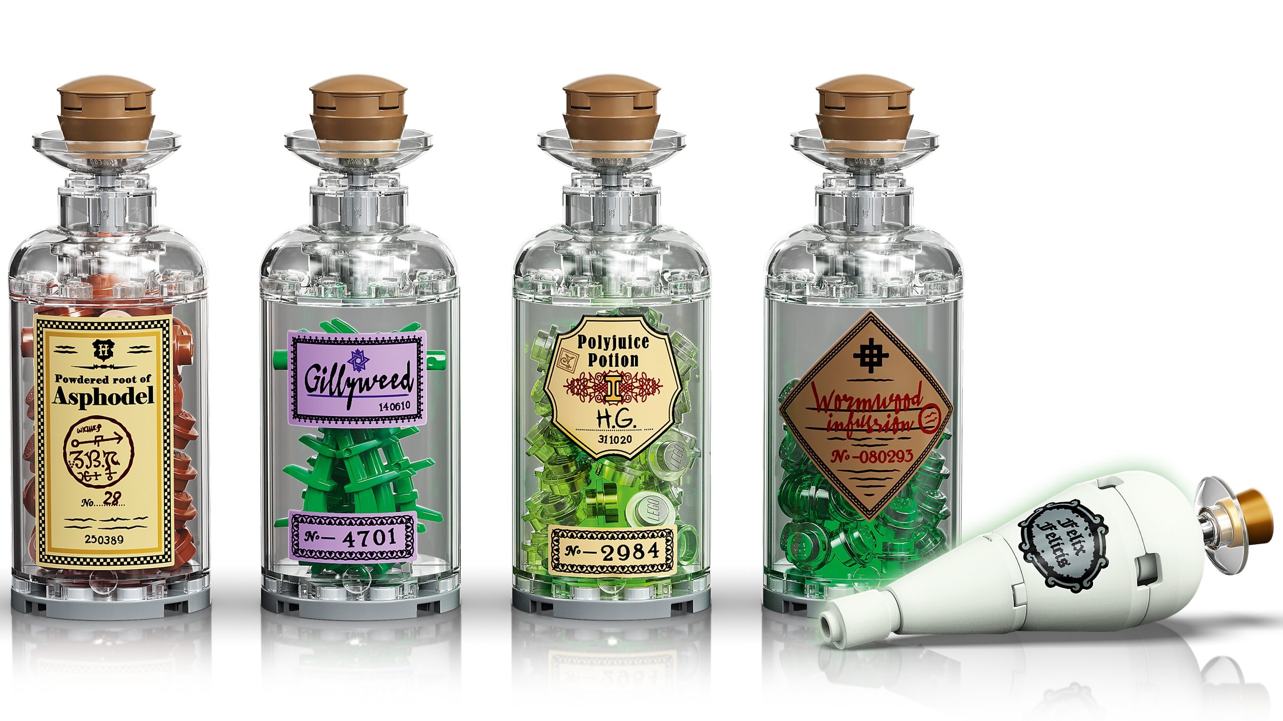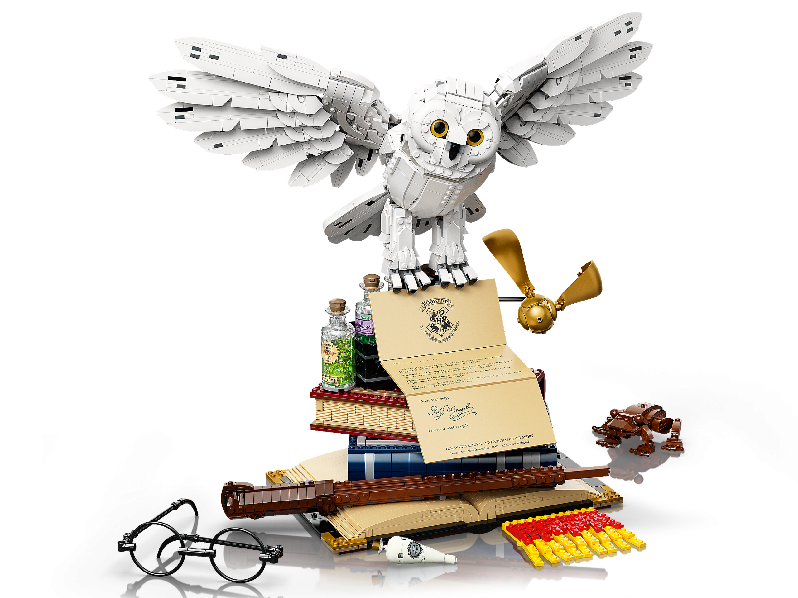 This homage to the Wizarding World of Harry Potter features many iconic artefacts in a single, stunning model. There’s Harry’s wand and glasses; Ron’s chocolate frog; Hermione’s potion tray containing 5 bottles of potions and magical ingredients (including Gillyweed, Felix Felicis ‘liquid luck’ and Polyjuice); Tom Riddle’s diary; the Golden Snitch; and a school scarf (customizable to suit any Hogwarts™ House). On top of this enchanting ensemble sits Hedwig™ the owl, holding a much-coveted invitation to Hogwarts. This fascinating model is accompanied by 3 exclusive golden minifigures – Albus Dumbledore™, Minerva McGonagall™ and Rubeus Hagrid™ – and a display stand with a decorated tile celebrating 20 years of LEGO Harry Potter.