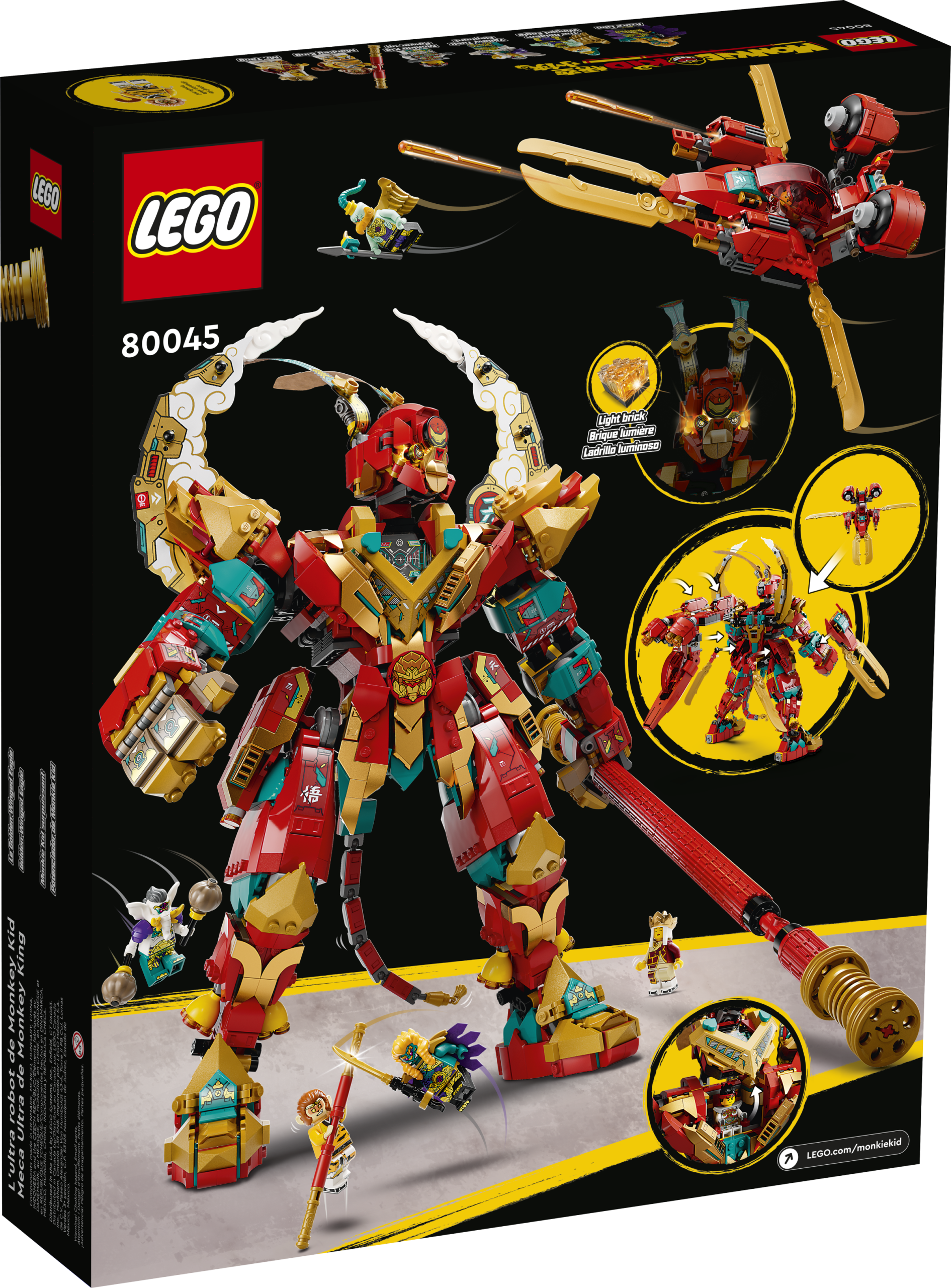 Get kids aged 10 and up excited about classic legends with this brick-built LEGO® Monkie Kid™ Monkey King Ultra Mech (80045). The set recalls the original Monkey King Warrior Mech, with updated features and functions to extend play, including rear rocket boosters, a new armor design, newly designed Golden Sight power with a light brick, a staff and other weapons that can be transformed into a jet.