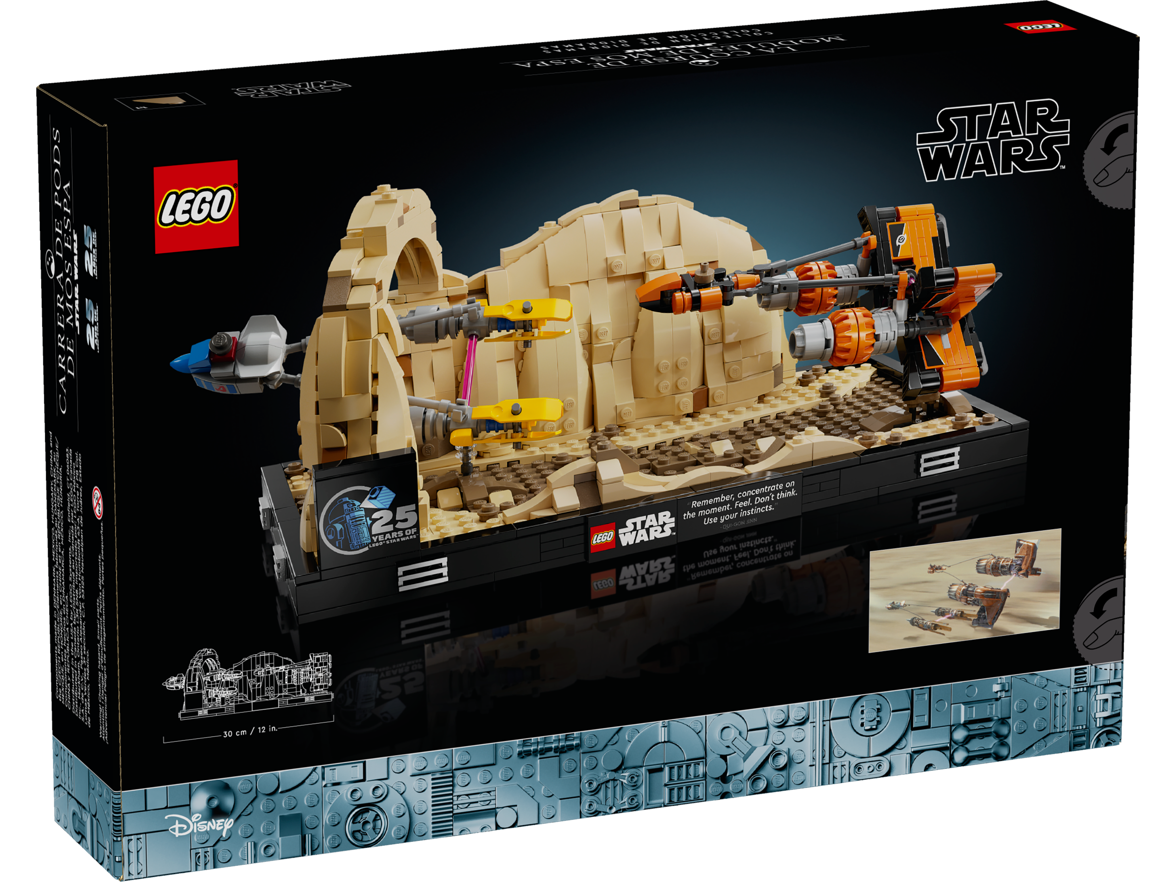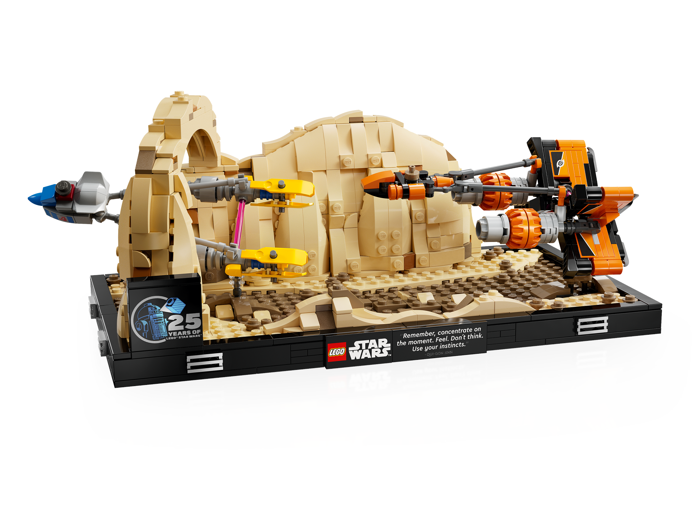 The impressive build-and-display model comes with a plaque bearing Qui-Gon Jinn’s advice (“Remember. Concentrate on the moment. Feel. Don’t think. Trust your instincts.”) and a LEGO Star Wars 25th anniversary brick.