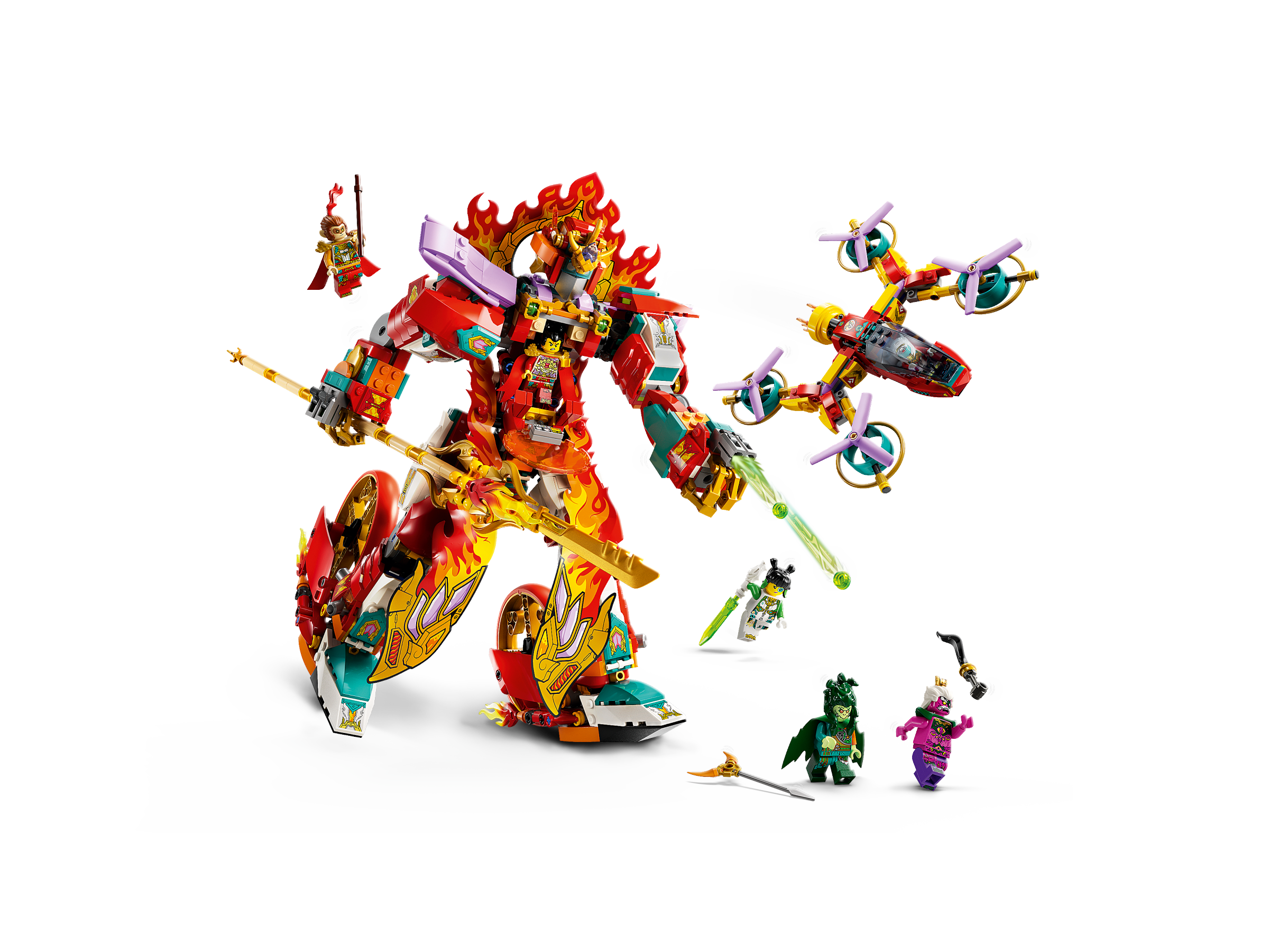 Heroes, adventures and fun await mech toy fans aged 9 and up with this Nezha’s Ring of Fire Mech (80057) LEGO® Monkie Kid™ playset. It makes a cool gift and features a posable mech action figure with wheels, an opening cockpit and 6 fire energy shooters, plus a kids’ drone toy with room for a minifigure. The set includes 6 minifigures: Monkie Kid, Mei, Monkey King, Nezha, the Nine-Headed Demon and the 100-Eyed Demon, plus battle weapons, play starters and a purple Color Stone.