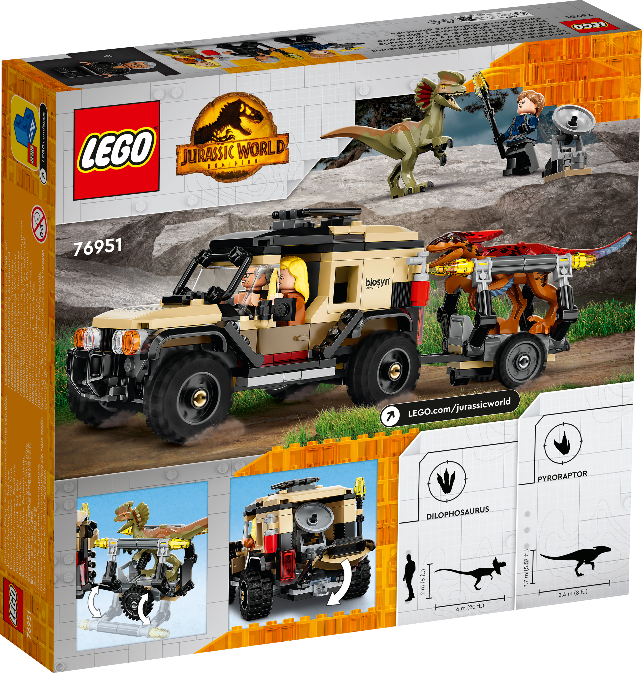 Children can roleplay as popular Jurassic World: Dominion characters tracking dinosaurs in an off-road vehicle with this exciting Pyroraptor & Dilophosaurus Transport (76951) toy playset. The off-roader has seats for 2 minifigures, a removable dinosaur tracker and a detachable trailer with an opening cage that can hold a dinosaur figure. There are also 3 LEGO® minifigures – Ian Malcolm, Dr. Ellie Sattler and a guard with a tranquilliser accessory element – plus Pyroraptor and Dilophosaurus dinosaur toy figures to inspire creative storytelling.