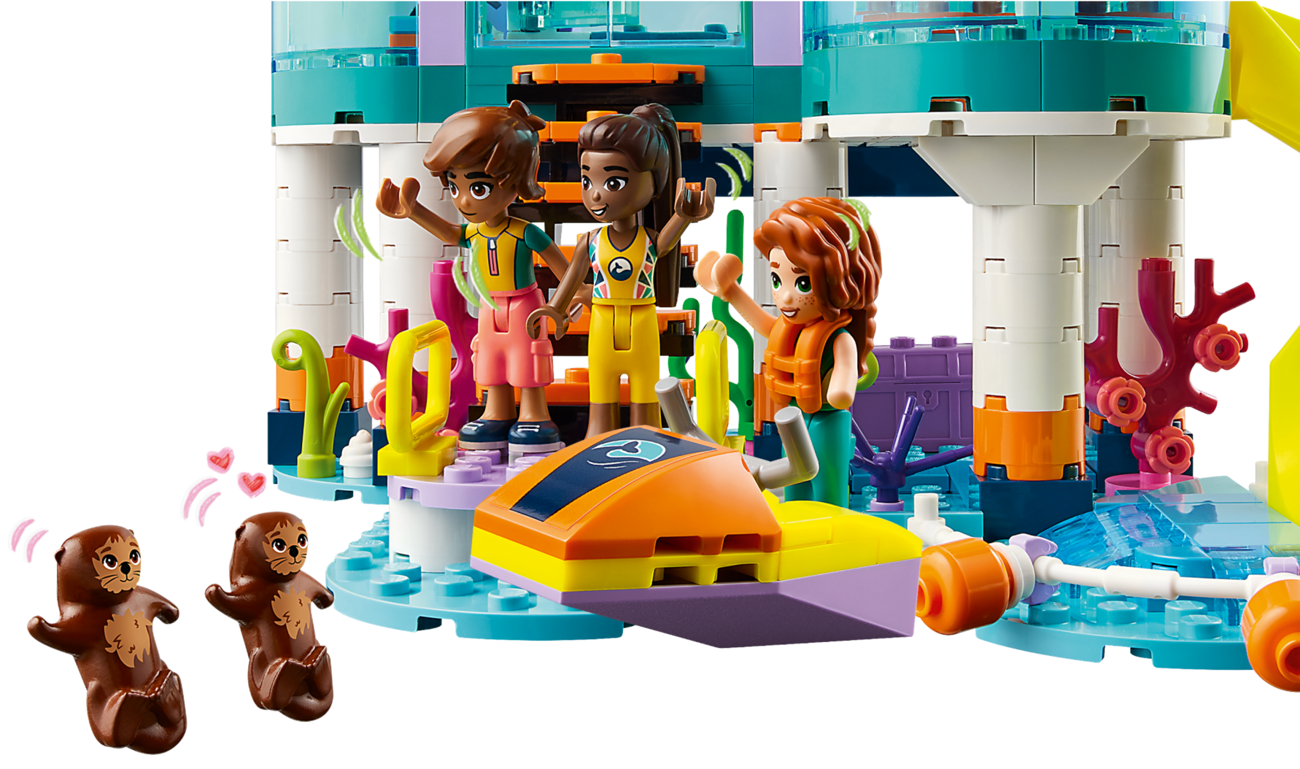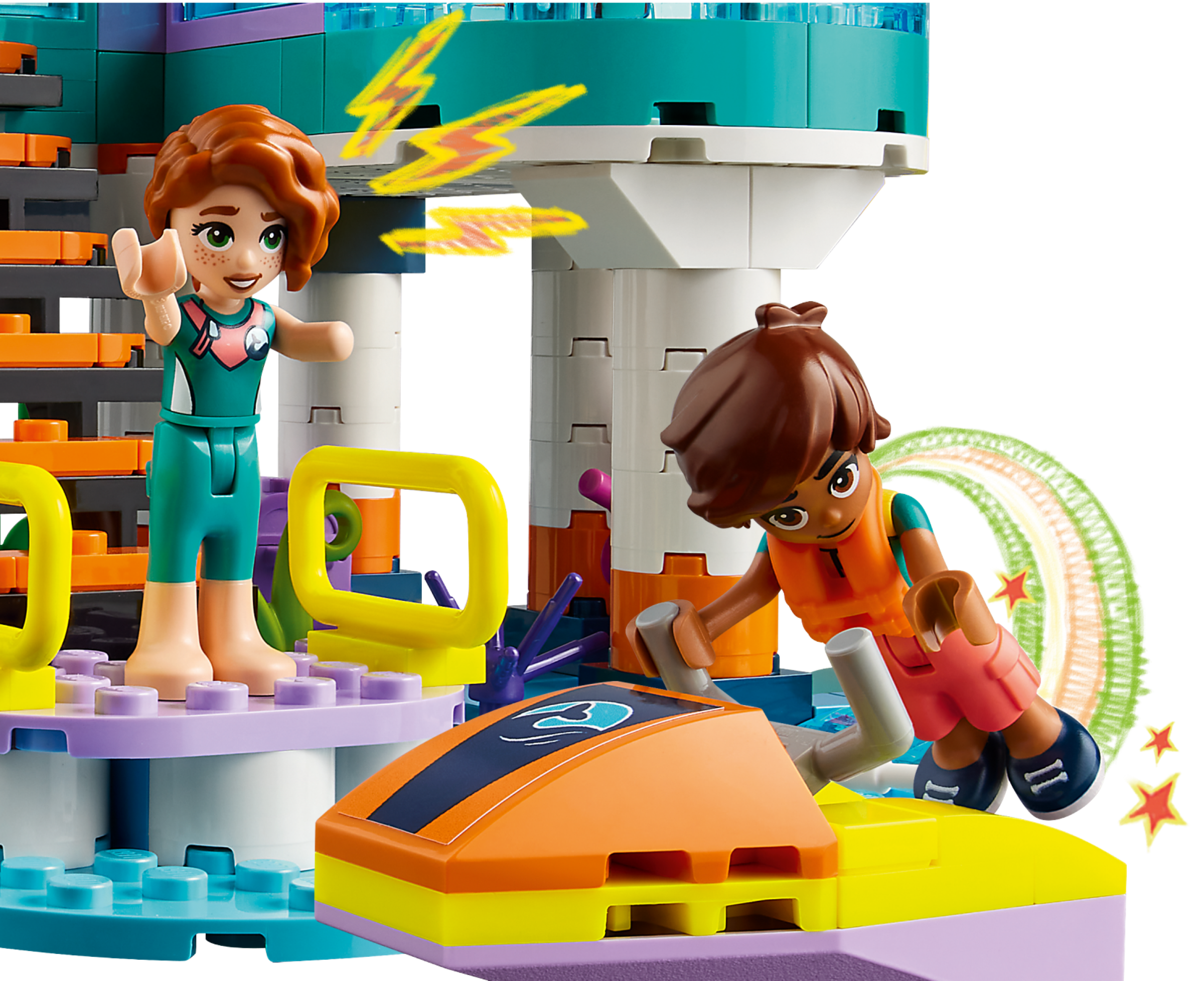Kids ages 7 and up who love animals can act out ocean stories with this LEGO® Friends Sea Rescue Center (41736) toy. The set comes with 3 mini-dolls and 2 sea otters, a seahorse and a sea turtle, plus lots of accessories to inspire pretend play. Kids can use the water scooter to pull up to the dock, then head inside to clean, x-ray and feed the otters. Then they can help the otters slide into the rehabilitation area. When the otters are well again, they can swim back into the ocean. Accessoriesinclude a life vest, feeding bottle, walkie-talkie, treasure chest, camera, computer, microscope, syringe and an X-ray machine.