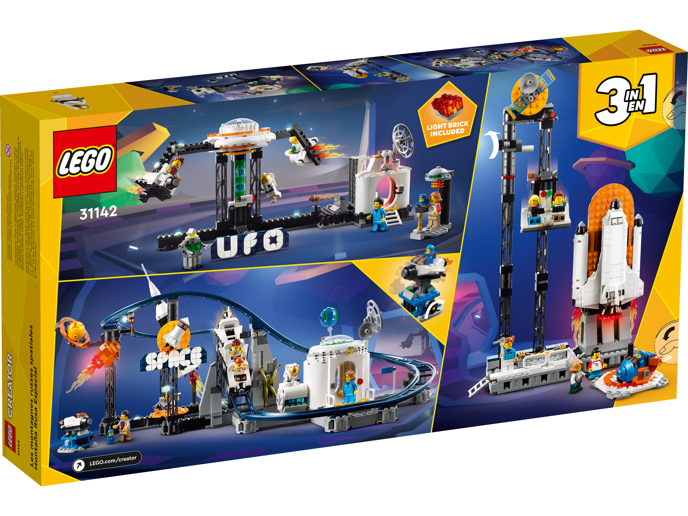 Space fans aged 9 can enjoy an exhilarating trip to an amusement park with this highly detailed LEGO® Creator 3in1 Space Roller Coaster (31142). The playset includes a winding roller coaster track featuring 3 moving carts for fun rides, which zoom past objects in the solar system, like a decorative space rocket, models of Saturn and Earth, a moon base and a shooting star. There is also a cool meteor with a light brick that can be illuminated, plus 5 minifigures.