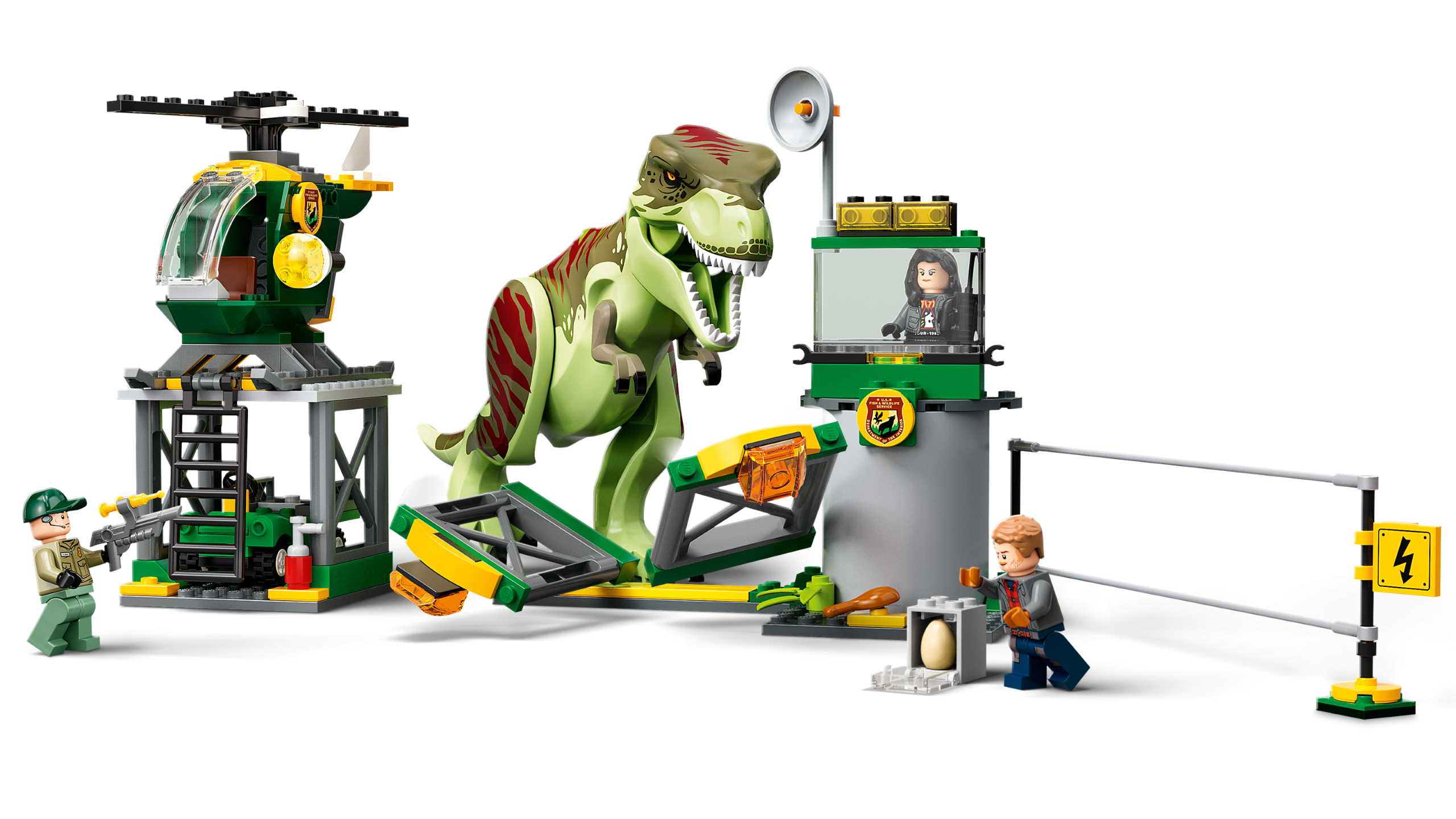 Youngsters who love dinosaurs and cool vehicles will enjoy learning to build with this LEGO® Jurassic World T. rex Dinosaur Breakout (76944) toy playset for kids aged 4 and up. It features an airport with a helipad, garage, helicopter, buggy and collapsible fence, plus a posable T. rex figure. There are also 3 minifigures – Owen Grady, Zia Rodriguez and a wildlife guard – with accessory elements such as a dinosaur egg and walkie-talkie to inspire imaginative play.