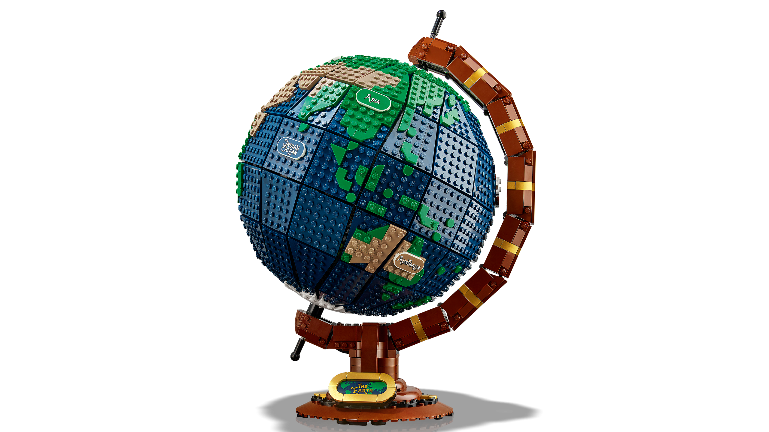 Where do you want to go today? Dream of your next travel destination as you build The Globe (21332). Created by a fan-designer and brought to the world by the LEGO® Ideas team, this display model recreates the spinning movement of a vintage Earth globe with the help of LEGO Technic™ elements and features glow-in-the-dark tiles decorated with the names of continents and oceans. There are buildable ship and compass icons, plus ‘The Earth’ nameplate to complete a charming centrepiece to enhance the decor of any home or office.