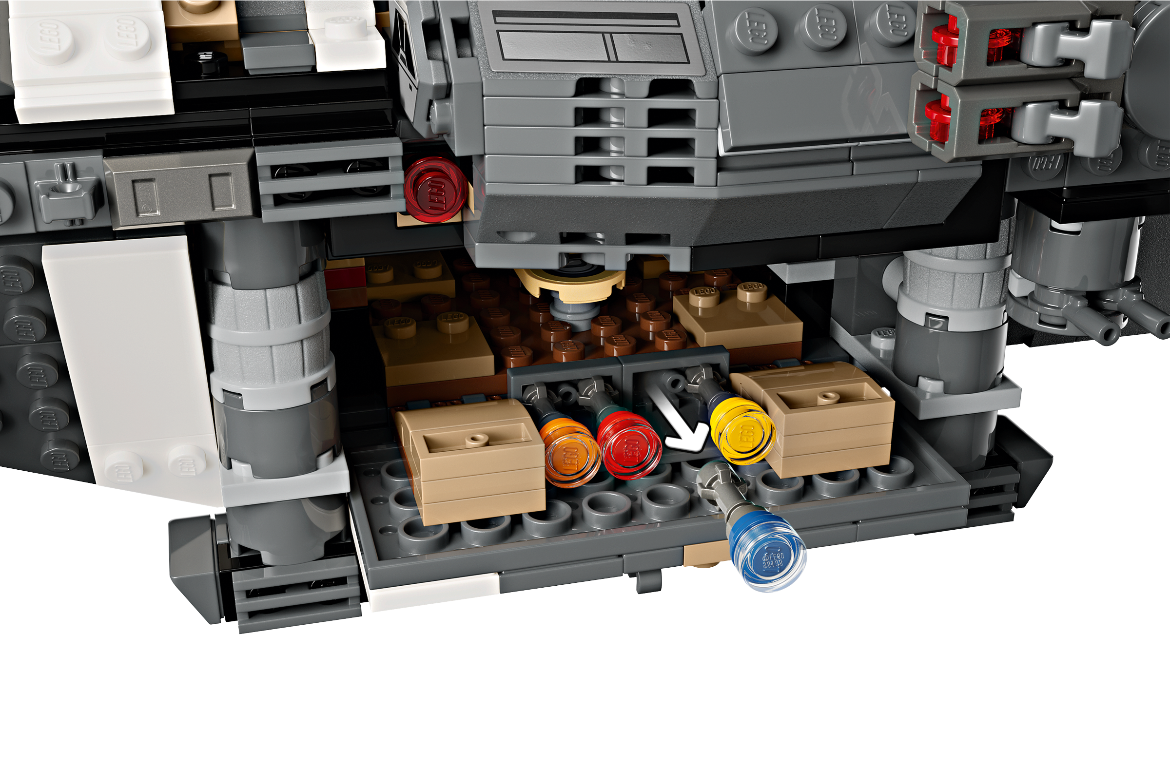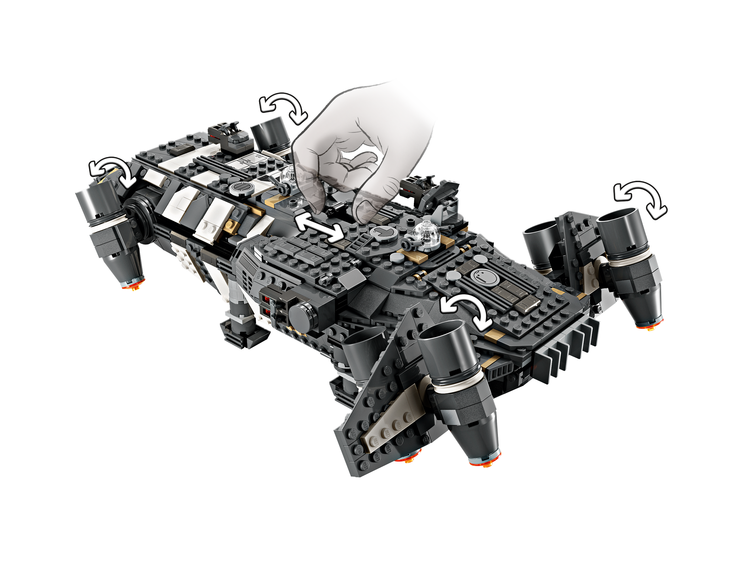 Kids become the heroes in their own Star Wars: Skeleton Crew stories with a detailed LEGO® brick recreation of The Onyx Cinder (75374). This collectible LEGO Star Wars™ buildable starship toy features rotating engines for landing/takeoff or flight, 2 stud shooters, 2 rotating turrets, each with 2 stud shooters, and a grabbing claw. It has seats for all 5 included LEGO Star Wars characters (the Jod LEGO minifigure in the cockpit and Wim, Fern, KB and Neel in the passenger compartment), plus storage for the 4 buildable torches and other cargo. There is also a kitchen table and a bed, plus accessory elements including fruit and a walkie-talkie to inspire creative play.