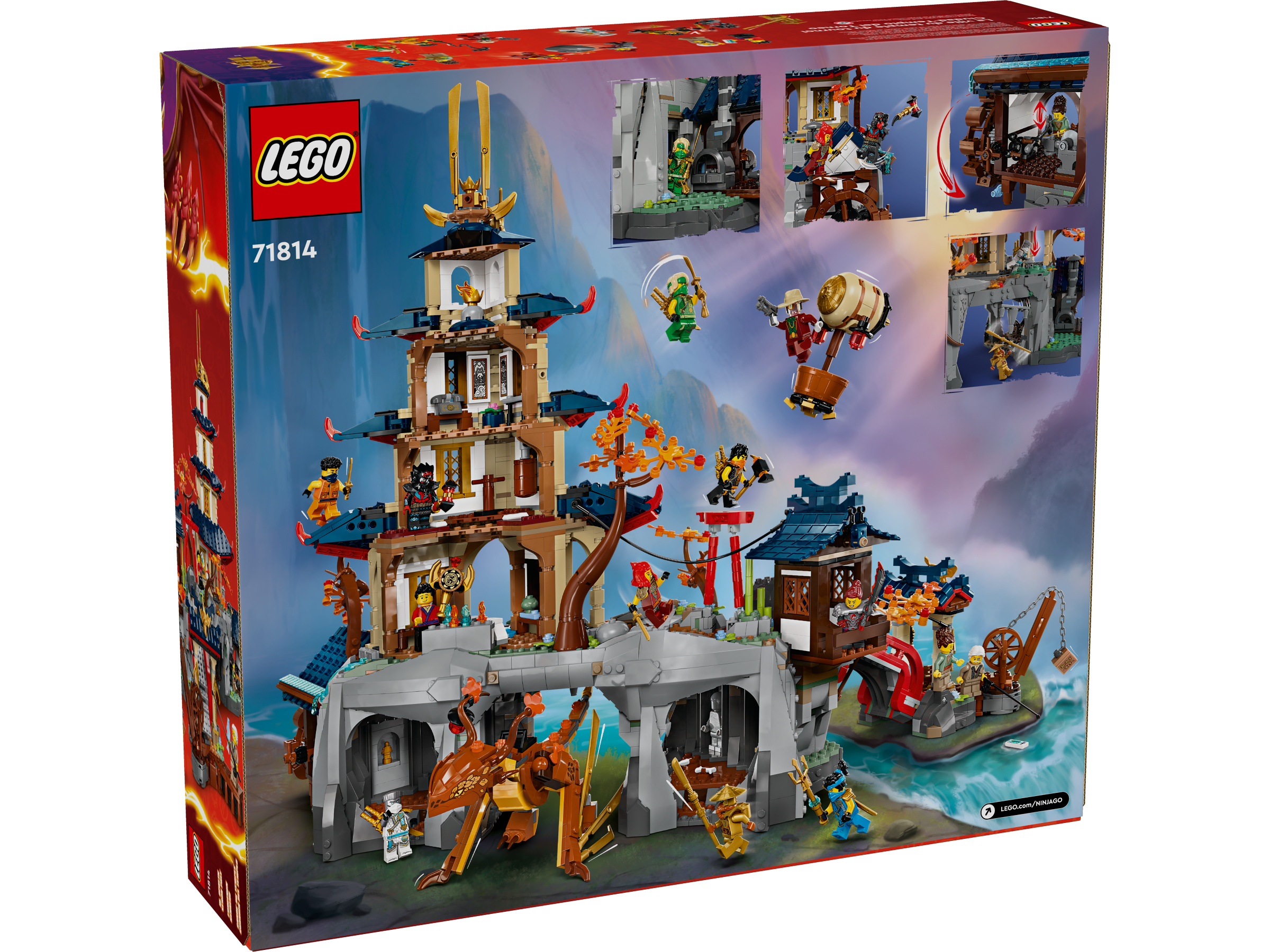 The NINJAGO temple built into a rock face features a 4-tiered pagoda, a bridge, a water mill kids can turn to move 2 battle platforms and a blacksmith’s hammer, plus falling rocks that are activated by pressing a lantern, hidden storage and a secret door. Kids can turn the temple around, where its open back provides extra play options and the chance to create fun little stories.