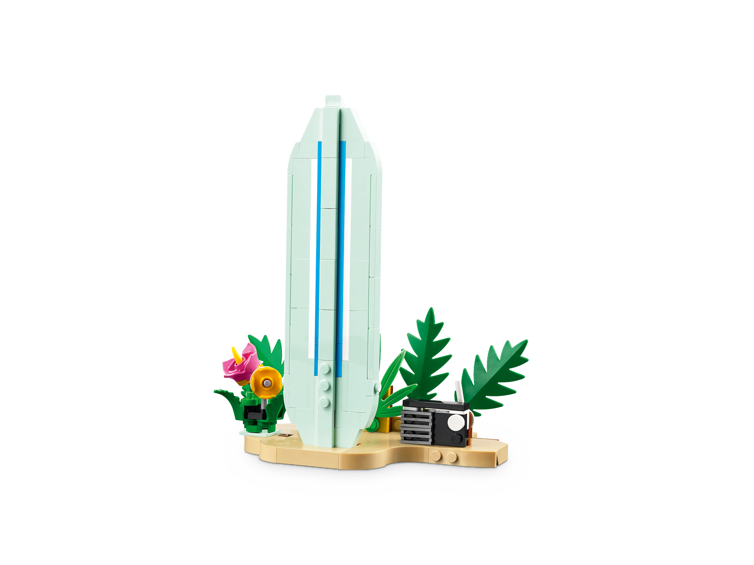 This LEGO Creator 3in1 set gives kids 3 different build-and-play experiences using the same bricks. They can build a ukulele instrument toy, rebuild it into a small leaping dolphin toy on an ocean and beach stand, with a palm tree, flowers and a seashell, or make a detachable surfboard toy on a beach scene stand with flowers and a radio.